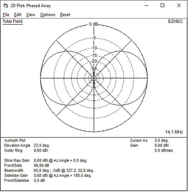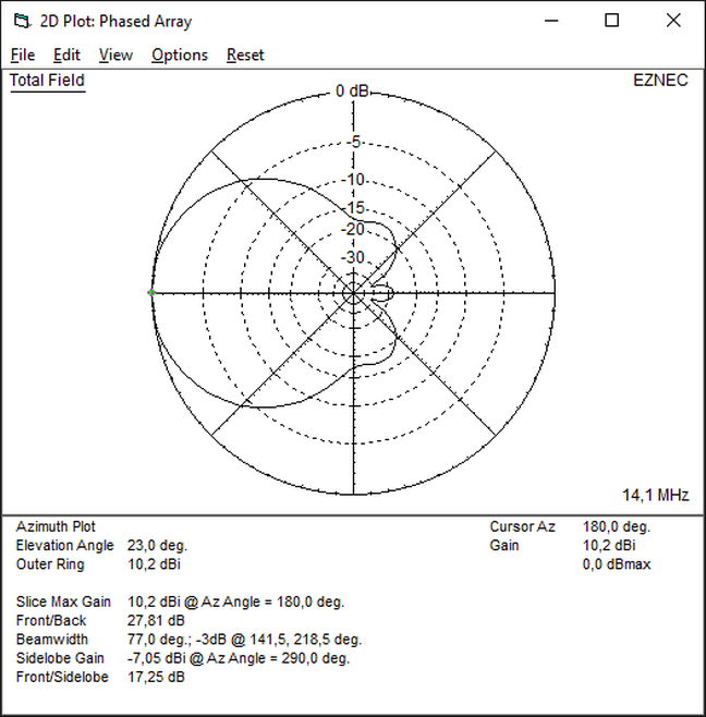 Die Elemente sind 6,4m lang, der Elementabstand beträgt 3,0m, die Aufbauhöhe ist 10m. Als Ground Type wurde Free Space gewählt.